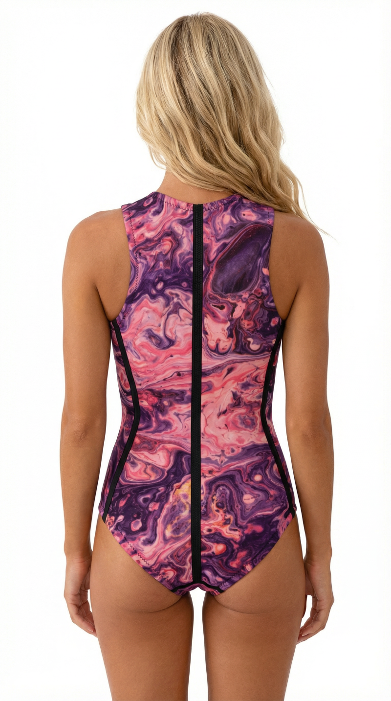 Vystup z řady s těmito dámskými neoprenovými plavkami z 3mm prémiového neoprenu, které spojují funkčnost, pohodlí a výrazný design. Díky unikátnímu abstraktnímu vzoru je na každém kousku jiné rozmístění barev, což z něj dělá naprostý originál.